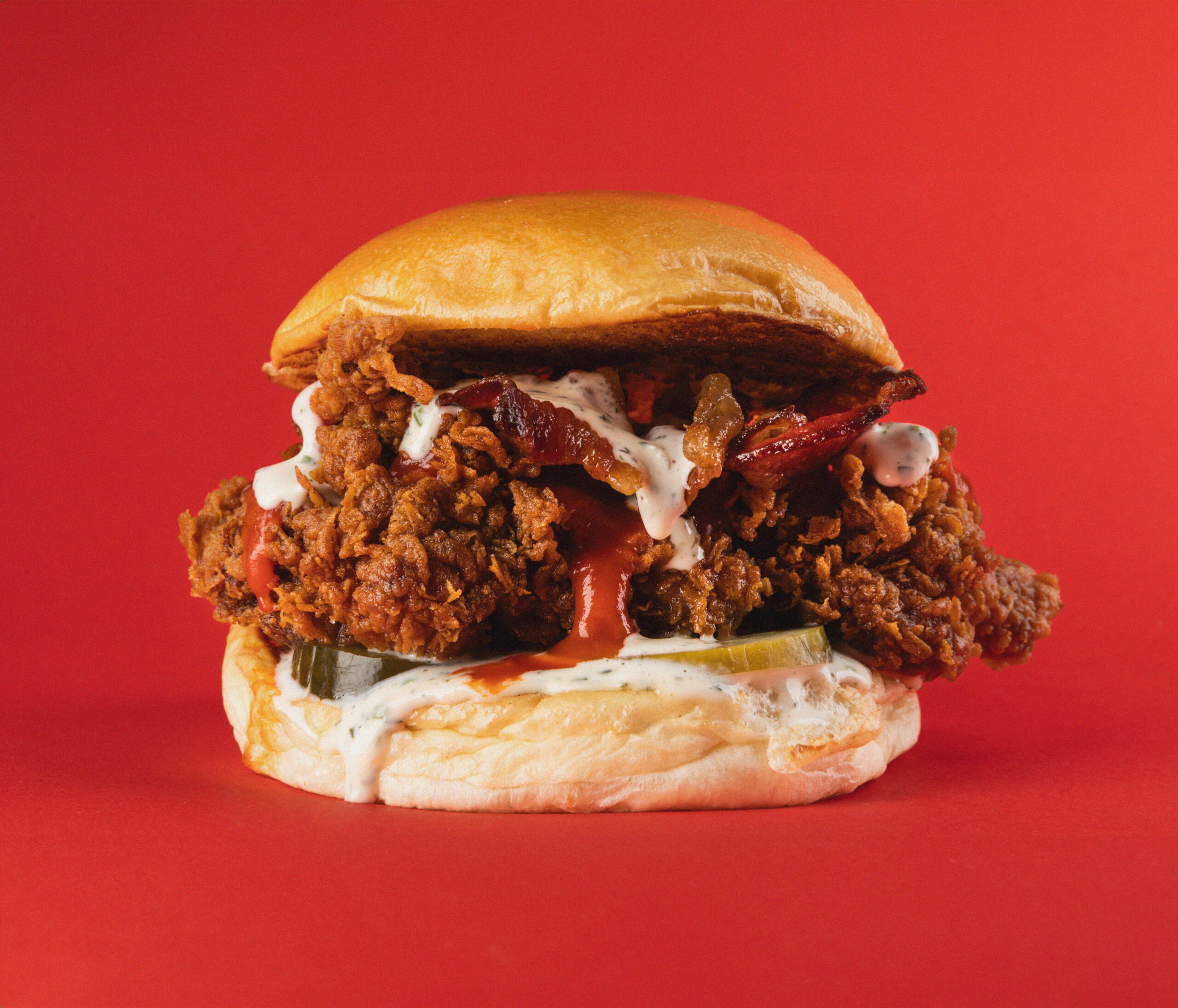 Buttermilk fried chook, trashcan bacon, spicy mayo & thick-cut pickles.